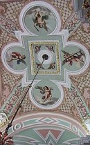 St Petersburg has a 300yr anniversary next year (2003) and everything is being tarted up for it. Inside the Cathedral is the tomb with the (recently found) remains of the Romanovs as well at the tomb of Peter the Great (Peter I) and some more guys called Pete. The ceiling is very nice (and re-done, likely as not) - see left. The place is heaving with tourists (like us) and particularly tour groups which huddle around their guide and block the way for individuals. This makes us very aware that this is what we probably do in our group - and in future we will show some of the consideration I was seeking now, whilst trying to get past. |